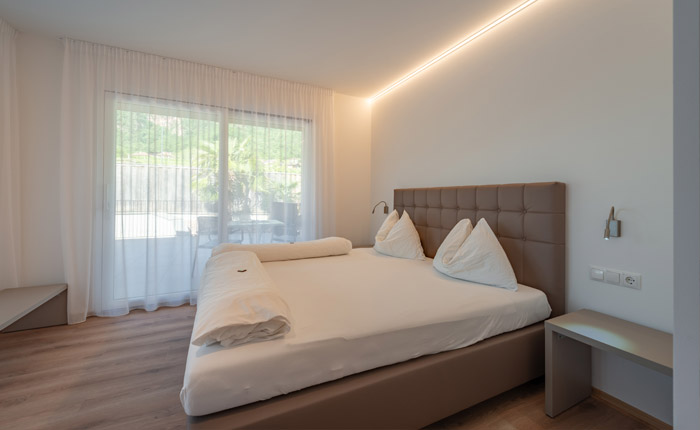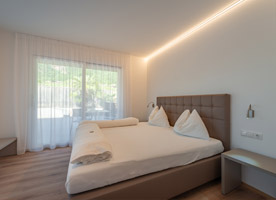 Schönes modern eingerichtetes Familienzimmer. Elternzimmer - Kinderzimmer durch eine Schiebtür getrennt, Schreibtisch, Sitzecke, Dusche/WC, überdachter Balkon mit Gartenmöbel, Safe, Sat TV und herrlicher Panoramablick.